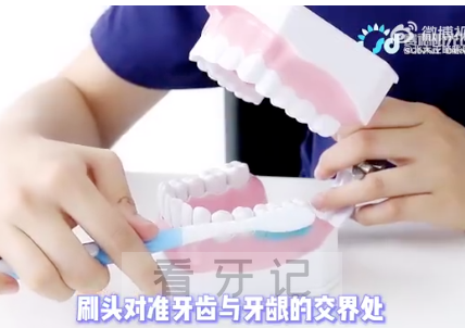 将牙刷对准牙齿与牙龈交接的地方,刷毛与牙齿大致呈45°角,同时将刷毛向牙齿轻压,使刷毛略呈圆弧,将刷毛的一部分尽量深入到牙龈与牙交接的缝隙里,短距离水平震颤地去刷。