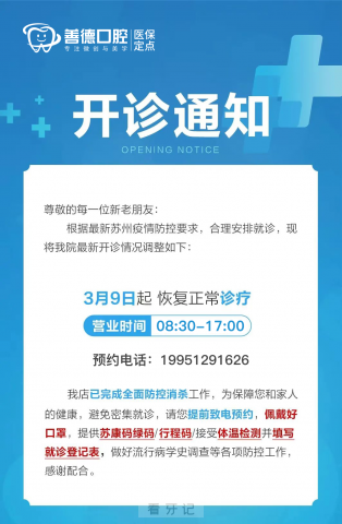 苏州善德口腔恢复正常诊疗 2022年3月9日 13:50 • 最新动态 3月9日起,苏州善德口腔恢复正常诊疗,具体防疫要求请参见上图,营业时间为上午8点30至下午17点。 本文内容源自网络仅供参考,不作为诊断医疗依据,更多查询请 → 在线咨询客服 善德口腔苏州苏州善德口腔 相关推荐 最新动态 汉中市口腔医院深入学校进行口腔健康知识科普活动 为提高儿童口腔健康保健意识,汉中市口腔医院组织医护人员前往汉台中学、城西幼儿园、南关小学、汉中市幼儿园、东辰外国语学校、恒大小学、滨江第四幼儿园7所学校开展口腔健康科普活动。医护人… 2025年4月26日 最新动态 厦门口腔十强排行榜排名前十有哪些?十大名单出炉 阳春三月芳菲尽,最美厦门四月天!转眼四月来了,2024已过四分之一,各位看牙的事情要提上日程啦,不能一直拖哦!以下是老谭刚刚整理出来的2024年厦门看牙好牙科医院排行榜排名前十名单… 2024年4月16日 最新动态 瑞士 ITI 种植体为何价格这么贵?瑞士 ITI 种植体到底好在哪里? 在口腔种植领域,瑞士 iti 种植体一直以 “高端、可靠” 的形象深入人心,被誉为种植牙界的 “瑞士精工”。 无论是缺牙多年的中老年患者,还是因意外缺牙的年轻人,在选择种植体时,瑞… 2025年6月8日