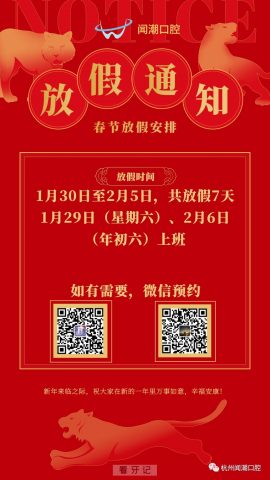杭州闻潮口腔门诊部春节放假安排 2022年1月23日 22:37 • 最新动态 闻潮口腔门诊部春节放假安排如下: 闻潮口腔位于钱江路239号(候潮府商铺8-103),门诊部面积200平方米,设有5个椅位,拥有符合国家标准的种植手术室及消毒设备。 本文内容源自网络仅供参考,不作为诊断医疗依据,更多查询请 → 在线咨询客服 杭州闻潮口腔闻潮口腔 相关推荐 最新动态 肥城市中医医院“全国爱牙日”健康义诊活动 9月20日是第36个“全国爱牙日”,今年的主题是“口腔健康 全身健康”,为更好地提升广大居民的口腔保健意识,增强口腔保健观念,让大家拥有健康的牙齿,享受美好生活,在2024年爱… 2024年9月21日 最新动态 **口腔开展“世界口腔健康日”科普宣传周系列活动 为积极响应FDI世界牙科联盟的号召,贯彻落实《健康中国行动(2019-2030年)》的指导方针和政策,提升大众口腔健康素养,山东**(山东**医院)将在3.20“世界口腔健康日”来… 2023年3月20日 最新动态 为什么洗牙的时候医生会推荐冷光美白? 为什么洗牙的时候医生会推荐冷光美白?主要是因为洗牙无法真正解决牙齿变白的问题。 冷光美白的优势有以下四种 1. 快速便捷:冷光美白能够在短时间内显著提升牙齿的亮度,通常只需30分钟… 2024年12月22日