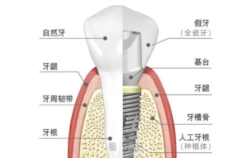 种植牙的结构分为三个部分:种植体(人工牙根)、基台(连接体)和牙冠(牙齿)。但是它的重要性的程度:种植体>基台>牙冠!